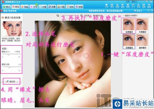 1、用“美圖秀秀”軟件打開(kāi)素顏照片,在“美容”菜單下執(zhí)行“磨皮去痘”操作。如圖2所示的操作順序,先進(jìn)行一鍵“深度磨皮”后,接著調(diào)節(jié)好畫(huà)筆的大小力度對(duì)一些局部細(xì)節(jié)處進(jìn)行手動(dòng)磨皮,再執(zhí)行“輕度磨皮”,最后選擇“橡皮擦”功能涂沫照片人物的眼睛、眉毛、頭發(fā),以保留五官的細(xì)節(jié)。