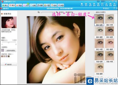 6、眼睛的部分處理完畢后,人物的皮膚仍偏紅,于是在“美白”下選擇一鍵式“美白-輕度”操作,如圖7所示。