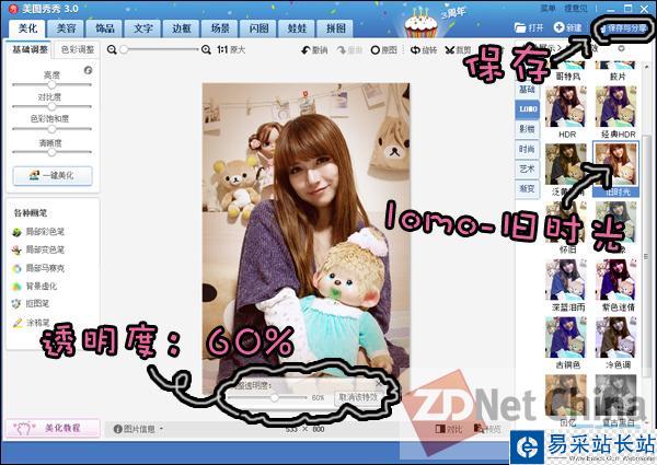 第三步:再選擇“LOMO”分類下的透明度為60%“舊時光”特效,在進一步增強暖黃的色調的同時,為照片增添時尚流行的復古元素,最后點擊保存,就大功告成啦!