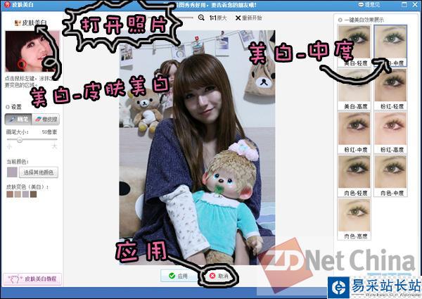 第一步:在“美圖秀秀”軟件下打開一張待處理的照片,進入“美容”菜單下,選擇“皮膚美白”功能中的“美白—中度”,輕松一鍵改善黯淡問題。