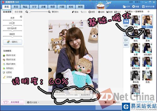第二步:接著進入“美化”菜單下,選擇“基礎”分類下的“暖化”特效,并將特效透明度調至60%,適當調節透明度可以防止照片局部過爆。