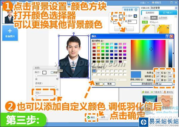 3、跳轉(zhuǎn)到摳圖換背景界面下,點(diǎn)擊背景設(shè)置—顏色方塊,在顏色選擇器中選擇背景顏色,也可以自定義背景色值,然后將前景羽化值調(diào)低后點(diǎn)擊“確定”。
