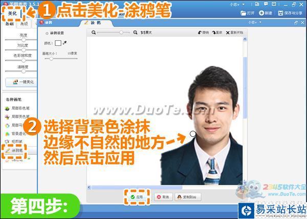 4、自動(dòng)摳圖后如果邊緣有不自然的地方,可以點(diǎn)擊“美化—涂鴉筆”,在涂鴉界面下,選擇背景色的畫筆來調(diào)整邊緣。