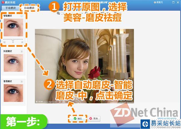 1、在軟件下打開待處理的照片,點擊“美容”標簽,選擇“磨皮祛痘-智能磨皮-中”,使皮膚看起來更光滑。