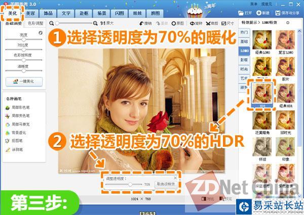 3、然后點擊“美化”標簽,分別使用透明度為70%的“暖化”、70%的“HDR”,為照片營造華麗氛圍。