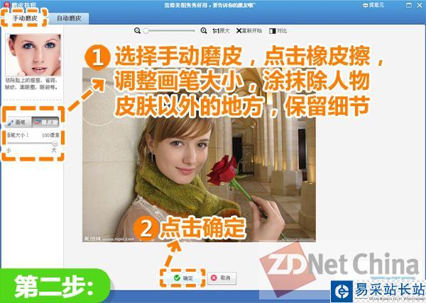 2、接著選擇“手動磨皮”,點擊橡皮擦,調整合適的畫筆大小,涂抹除人物皮膚以外的地方,使宮殿以及人物的頭發、衣服的細節得以保留。