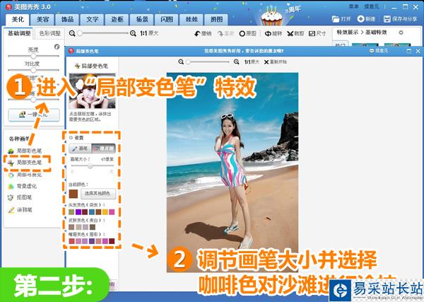 2、點擊“局部變色筆”按鈕,選擇咖啡色,將畫筆調整至合適大小,對沙灘進行涂抹,使沙灘顏色更加鮮亮。
