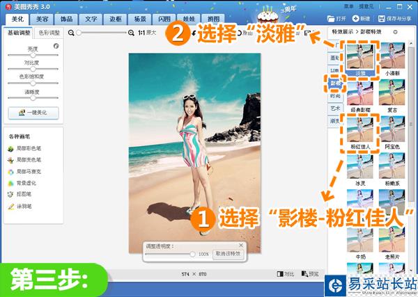 3、點擊“影樓-粉紅佳人”特效,再點擊“淡雅”特效,賦予照片復古氣息。