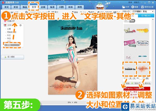 5、點擊“文字”標簽,進入“文字模版-其他”,選擇如圖素材,調整素材大小和位置并右鍵選擇合并,為照片增加時尚海報元素。