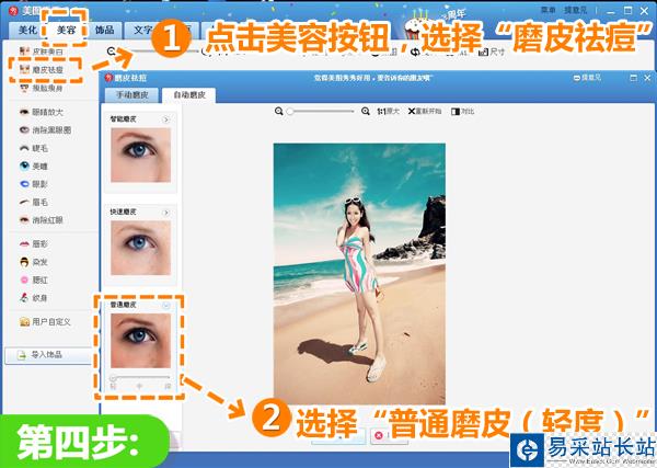 4、進入“美容”標簽下,選擇“磨皮祛痘-普通磨皮-輕”,使人物膚質更有質感。