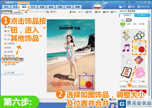 6、點擊“飾品”標簽,進入“其他飾品”,選擇如圖飾品,調整飾品大小及位置,右鍵選擇合并,至此復古的沙灘海報就輕松完成了!