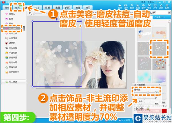 4、進入“美容”菜單下,點擊“磨皮祛痘”按鈕,選擇“自動磨皮—普通磨皮—輕”;然后再點擊“飾品—非主流印”,添加透明度為70%的光點素材,讓圖片更加唯美柔和。