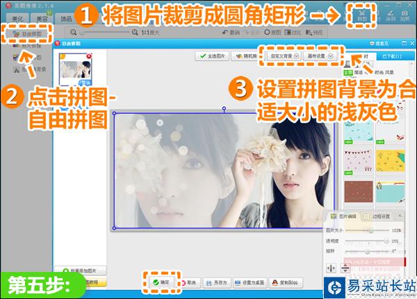 5、點擊“裁剪”按鈕,勾選“圓角裁剪”,將圖片裁剪成圓角矩形,再點擊“拼圖—自由拼圖”,給圖片添加淺灰色背景框。