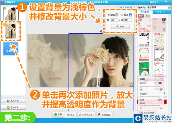 2、在“摳圖換背景”界面,點擊“背景設置”按鈕,將背景畫布設置為淺棕色,再調整背景大小;點擊“添加圖片”,將原圖作為背景加入,放大并適當調高透明度。