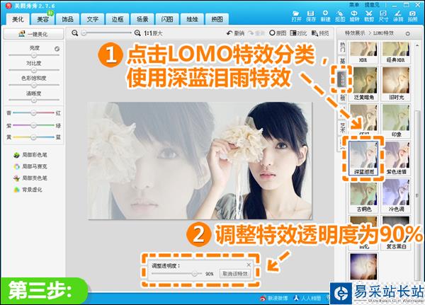 3、回到“美化”菜單,點擊“LOMO”特效分類,使用一個透明度為90%的“深藍淚雨”特效,為圖片營造清新感。