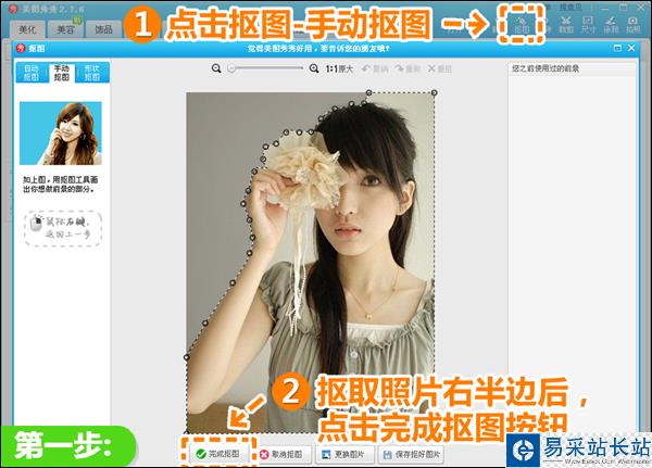 1、在“美圖秀秀”中打開待處理照片。點擊“摳圖—手動摳圖”,摳取照片的右半部分后,點擊“完成摳圖”按鈕。