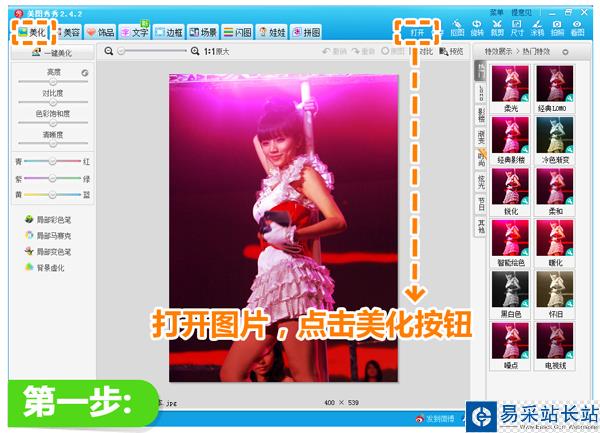 第一步:用“美圖秀秀”打開要處理的偏色照片,點擊“美化”菜單。