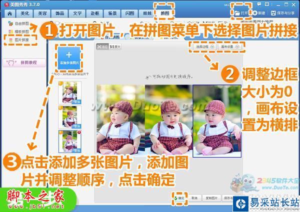 1、 在軟件下打開一張照片,進入“拼圖”菜單下,點擊“圖片拼接”,調整邊框大小為0,畫布設置為橫排,然后點擊“添加多張圖片”按鈕,添加圖片并調整圖片的順序,然后點擊“確定”按鈕。