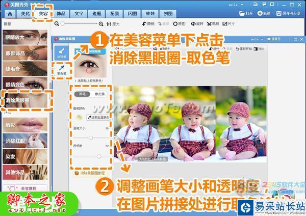 2、直接拼接的三張照片銜接處會有些不自然,那趕緊進入“美容”菜單下點擊“消除黑眼圈-取色筆”,調整畫筆大小和透明度,在圖片拼接處進行取色涂抹,使三張照片融合更自然。