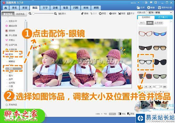 6、然后點擊“配飾-眼鏡”分類,選擇一個黑框眼鏡,絕對潮范兒哦!適當調整大小及位置后合并該飾品素材。