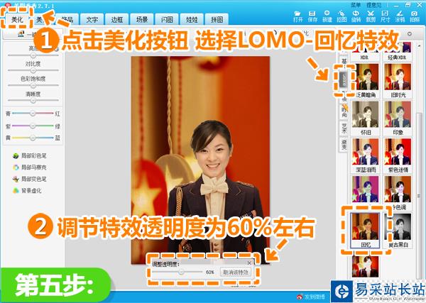 STEP5:最后為了讓人物和背景能自然地融合,進入“美化”菜單下,給圖片添加一個“LOMO—回憶”特效,可以根據需要適當調節特效的透明度,就大功告成啦!