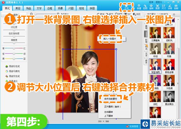 STEP4:接下來,再打開一張軍旅風格的背景圖,并右鍵選擇“插入一張圖片”,將剛才保存的PNG格式的圖片導入進來,適當調節大小位置后右鍵選擇“合并當前素材”。