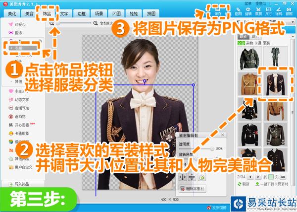 SETP3:接著進入“飾品”菜單下,選擇“服裝-軍裝”分類里,挑選一款喜歡的軍裝樣式,要調節素材的大小位置,盡量讓服裝和人物完美的融合,還得注意頭與脖子、肩寬的比例哦!設置好后,將圖片保存為PNG格式。