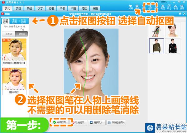 STEP1:在“美圖秀秀”軟件下,打開一張正面照片,點擊界面右上側的“摳圖”按鈕,選擇“自動摳圖”。在跳轉出來的新界面中,按照左側提示用摳圖筆在人物上畫綠線,即可輕松摳圖人像。