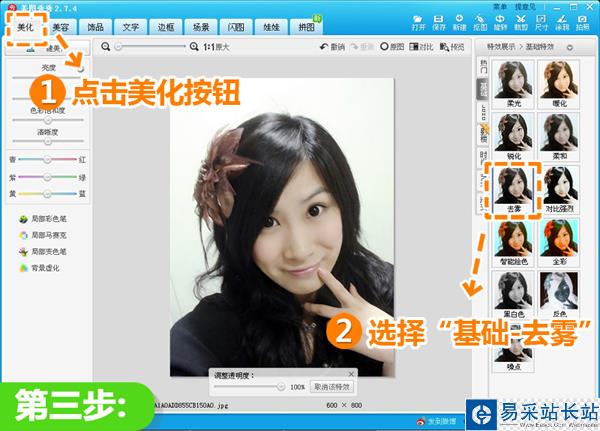 3、點擊“美化”菜單,選擇“基礎-去霧”特效,讓照片甩掉灰暗。