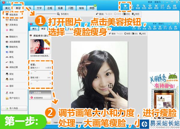 1、在“美圖秀秀”軟件下打開待處理的照片,點擊“美容”菜單,進入“瘦臉瘦身”功能,將畫筆調整到適合的大小(畫筆力度大處理對象不容易模糊),沿著臉的輪廓向內拉伸,然后用小畫筆處理嘴巴,輕輕松松變成小臉!