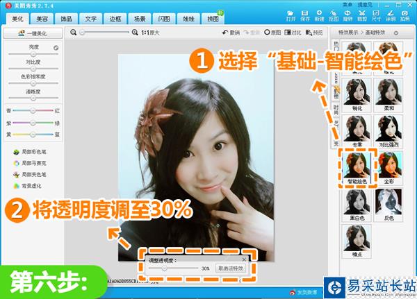 6、選擇“基礎-智能繪色”,并將透明度調至30%,增加照片色彩。