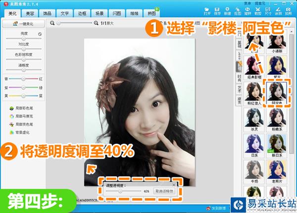 4、選擇“影樓-阿寶色”,并將透明度調至40%,使皮膚看起來比較白皙。