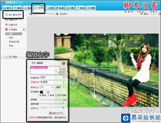 4、最后,進(jìn)入“文字”菜單下,用“輸入靜態(tài)文字”功能寫上一些喜歡的文字。時尚LOMO風(fēng)格的圖片效果就完成啦!