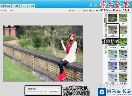 1、在“美圖秀秀”中打開原圖,在“美化”菜單下,選擇“LOMO”特效分類,首先使用“淡雅”特效,并根據(jù)圖片情況適當(dāng)調(diào)整特效的透明度。