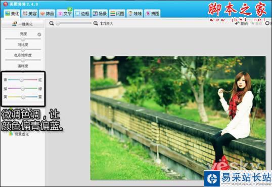 3、 只需鼠標(biāo)點一點,就可以讓多種特效疊加后的圖片變得很有LOMO的范兒了吧?接下來微調(diào)圖片色調(diào),讓圖片整體色調(diào)偏青藍(lán)色。
