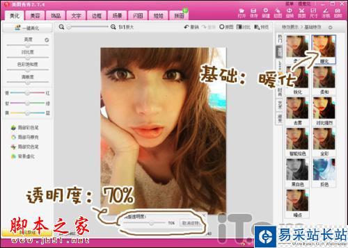 第二步:接著在“基礎”分類中,選擇透明度為70%的暖化特效。當然這個特效透明度的調節要根據照片的偏色程度來定。