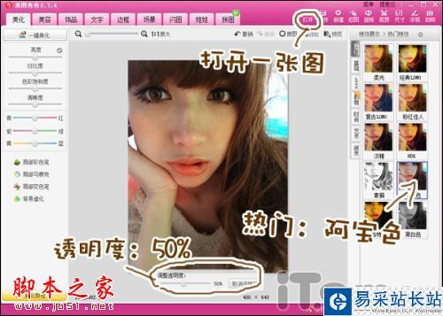 第一步:在“美圖秀秀”下打開一張偏黃的手機照片,先在“美化”菜單下,選擇“熱門”分類下的“阿寶色”特效,這里只是借助于阿寶色來調和原本偏黃的色調,所以要將特效透明度適當調低一點。