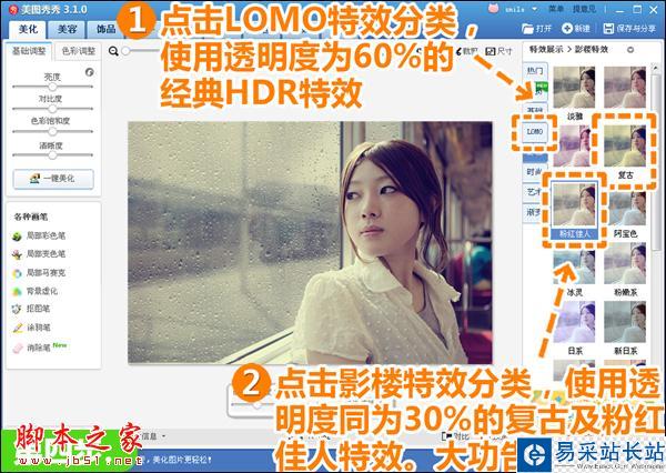 4、最后使用透明度為60%的“LOMO-經(jīng)典HDR”特效,再使用30%的“影樓-復(fù)古”及“影樓-粉紅佳人”特效即可。