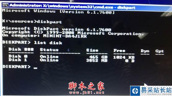 4.輸入:”list disk”,查看磁盤信息。注意看磁盤容量來選擇。圖中465G的Disk 0是硬盤,3852M的Disk 1是用于Win7安裝的U盤。