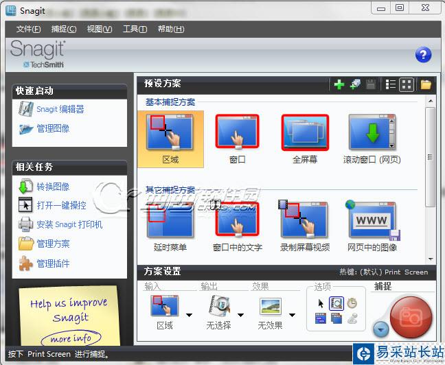 導入成功后點擊Snagit.exe打開程序,Snagit有一個主界面用于設置截圖的預設方案以及水印添加設置,另外還有一個Snagit編輯器可以修改圖片并保存截圖。