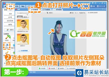 2、點擊摳圖筆-自動摳圖,摳取照片左側耳朵,點完成摳圖后跳轉界面,選擇前景作為素材