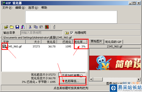 勾上要壓縮的圖片,其實這個時候已經(jīng)提示壓縮率什么的了,但是還是很大,我們可以通過 色彩降低來實現(xiàn),一般情況下,網(wǎng)頁圖片也不用這么多色彩。
