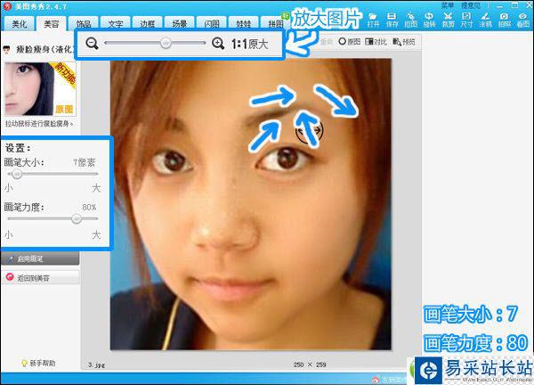 雜亂的眉毛沒來得及修,也可以用“瘦臉瘦身”功能來進行修整,并且放大圖片可以方便更多細節(jié)的處理。畫筆大小視眼皮寬度而定(這里設定為7),不要大于眼皮的寬度,力度依舊較大,設為80。修整眉毛時千萬注意不要拉到眼睛,以免眼睛細節(jié)被破壞!