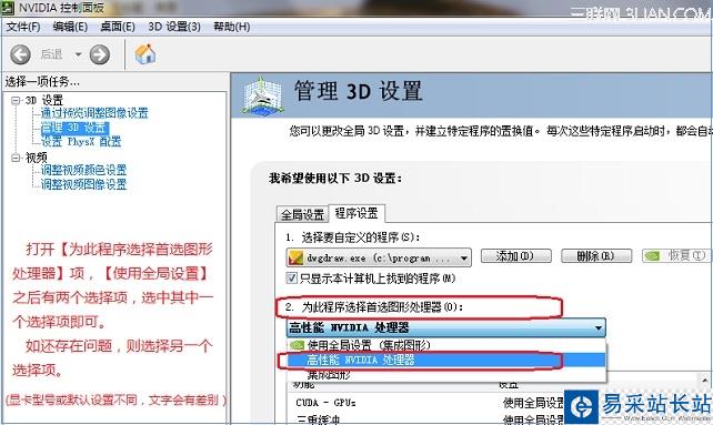 這種情況發生在計算機上有雙顯卡、且獨立顯卡是英偉達(nVidia)顯卡的用戶,您需要按以下圖示調整顯卡的設置: