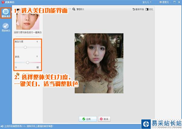 1、在“美圖秀秀”軟件下,打開待處理的一張照片,進入“美容”菜單下,選擇“皮膚美白”功能,在整體美白界面中選擇合適的力度。