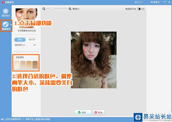 2、然后點擊局部美白功能界面,調整合適的畫筆大小和膚色,然后涂抹需要美白的部位就大功告成啦!