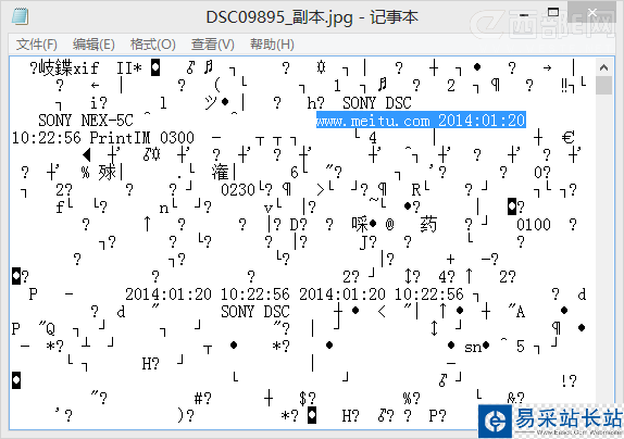 打開“記事本”,將照片拖到記事本中,會有一堆亂碼呈現在你面前。仔細看就會發現一些端倪。