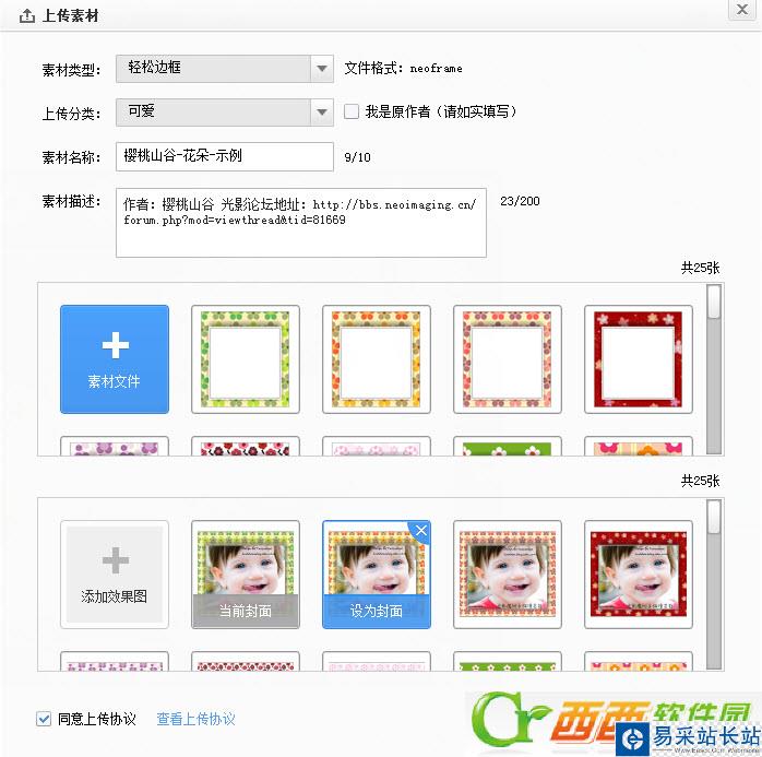 需選擇素材的分類,填寫素材名稱,可填寫對素材的描述(如果您是該素材作者,可勾選 “我是原作者” , 如果您不是原作者,上傳的時候最好在素材描述中標明素材的原作者和出處)