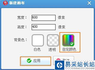 我們首先來新建一個畫布,點擊軟件右上角的新建按鈕,畫布的高度和寬度都可以是默認的600*400像素即可,當然也可以設置為自己想要的尺寸大小。然后點擊自定顏色,選擇為黑色,再點擊應用。