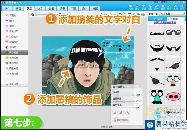 7.到“文字”菜單和“飾品”菜單中,分別給圖片添加搞笑的對白文字以及一些搞笑的素材